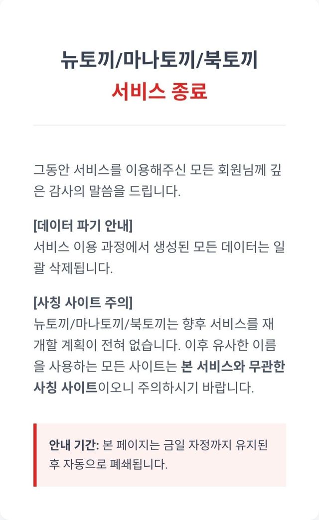 지난 27일 오전 문화체육관광부는 불법 콘텐츠 유통 사이트를 발견 즉시 긴급차단하는 제도를 공식 시행한다고 선언했다. 보도자료가 배포된 직후, 뉴토끼·마나토끼·북토끼는 사실상 동시에 서비스 종료 공지를 게시하고 접속을 차단했다.