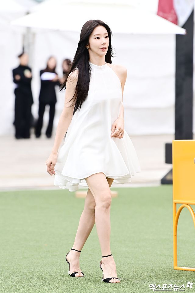 이주빈은 목선을 우아하게 감싸는 화이트 홀터넥 미니 원피스를 착용하고 등장했다. 어깨 라인을 시원하게 드러내 여성미를 강조하는 한편, 아래로 갈수록 자연스럽게 퍼지는 A라인 플레어 실루엣이 가볍고고 경쾌한 분위기를 연출했다. 특히 바람에 부드럽게 흩날리는 쉬폰 소재가 청초한 매력을 한층 돋보이게 만들었다.