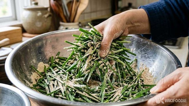 부추에 밀가루 입히고 찌는 과정 핵심 포인트
