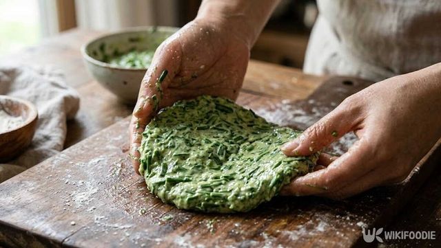 반죽이 정리되면 한 덩이씩 떼어 둥글게 굴린 뒤 손바닥으로 살짝 눌러 납작하게 만든다. 두께는 약 1에서 2cm 정도로 맞추면 익었을 때 식감이 고르게 살아난다.