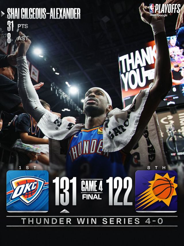 오클라호마는 28일(한국시간) 미국 애리조나주 피닉스의 모기지 매치업 센터에서 열린 2025~26 NBA 서부콘퍼런스 PO 1라운드(7전4승제) 4차전서 피닉스 선스를 131-122로 제압했다. 디펜딩 챔피언이자, 올 시즌 정규리그 1위 오클라호마는 4연승으로 피닉스를 잠재우고 서부콘퍼런스 PO 2라운드(준결승)에 진출하게 됐다. 다음 상대는 LA(3승)와 휴스턴(1승) 승자다.
