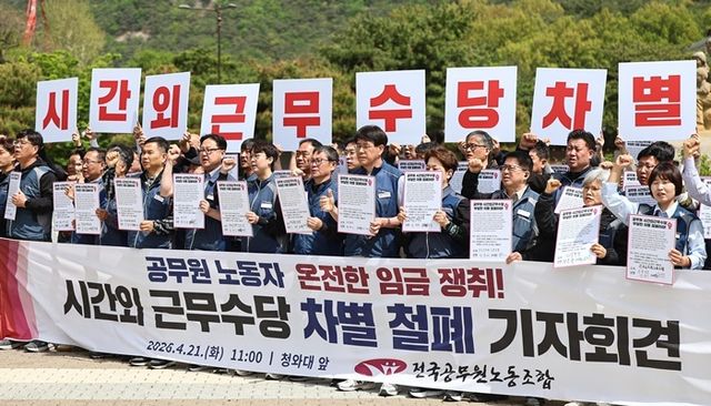 전국공무원노동조합 조합원들이 4월 21일 서울 종로구 청와대 앞에서 공무원 시간외수당 차별 철폐 기자회견을 하고 있다. / 뉴스1