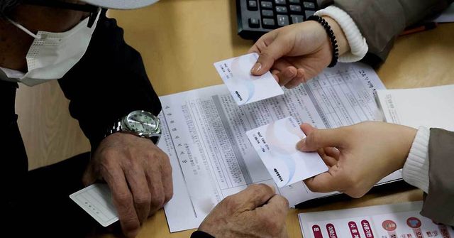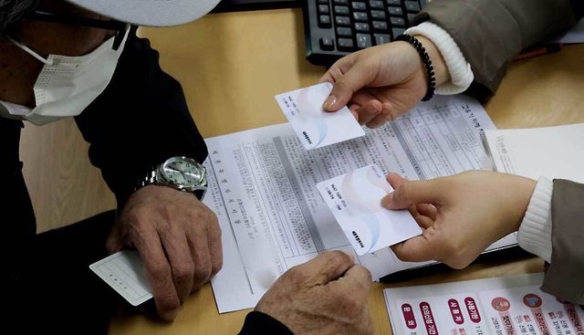 고유가 피해지원금 1차 지급이 시작된 27일 세종시 북세종통합행정복지센터에 마련된 지원금 접수처에서 신청 접수를 마친 시민이 2장의 카드에 나누어 지원금을 수령하고 있다. / 뉴스1