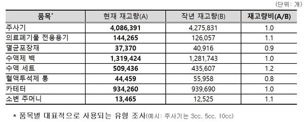 보건복지부는 28일 12개 보건의약단체, 산업통상부, 식품의약품안전처와 제5차 보건의약단체 간담회를 열고 의료품 재고 및 원료 공급 현황, 유통 관리 방안 등을 논의했다. 복지부가 지난 14일부터 20일까지 17개 시도 보건소를 통해 357개 의료기관(상급종합병원 25곳, 종합병원 206곳, 병원 126곳)의 의료품 재고 현황을 조사한 결과 주요 8개 품목의 재고량은 전년 대비 80~120% 수준으로 파악됐다. 주사기의 경우 3㏄, 5㏄, 10㏄ 재고량은 408만 6391개로 지난해(427만 5831개)의 96% 수준이다.