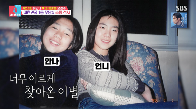 이어 “계속 슬프고 아픈 기운이 보여진다. 본인과 나이대가 비슷한 여자 한 명이 보인다. 앉았다 섰다 날벼락처럼 갔다는 소리가 나온다”고 말했다. 이에 허안나는 “언니가 마음이 아파서 일찍 갔다”며 2020년 언니가 세상을 떠났다고 밝혔다.