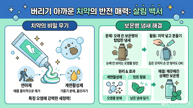 보온병을 오래 쓰다 보면 세제로 아무리 닦아도 가시지 않는 특유의 텁텁한 냄새가 남곤 한다. 이는 내부에 눈에 보이지 않게 조금씩 쌓인 오염물이 주원인이다. 이때 치약을 사용하면 입구 근처뿐만 아니라 손이 닿지 않는 깊숙한 곳의 냄새까지 손쉽게 잡을 수 있다. 치약 속 계면활성제가 오염물을 낱낱이 흩뜨려 떼어내고, 민트 계열의 향료 성분이 남은 냄새를 덮어주기 때문이다.