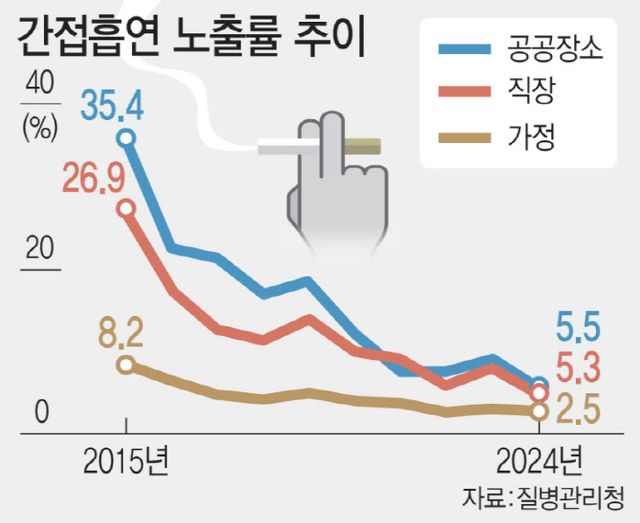 질병관리청이 발간하는 학술지 ‘주간 건강과 질병’ 최근호에 발표된 ‘간접흡연 노출률 추이’(2015~2024년)에 따르면 19세 이상 비흡연자의 실내 간접흡연 노출률은 2024년 기준 △가정 2.5% △직장 5.3% △공공장소 5.5%로 집계됐다. 10년 전인 2015년과 비교하면 큰 폭으로 감소한 수치다. 당시 노출률은 △공공장소 35.4% △직장 26.9% △가정 8.2%였다.