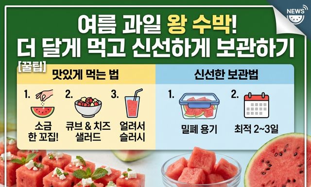 냉장 보관한 수박은 2~3일 안에 먹는 것이 가장 좋다. 시간이 지날수록 수분이 빠지고 조직이 무르면서 당도도 떨어진다. 껍질을 제거하고 과육만 따로 보관하면 보관 기간은 조금 더 길어지지만 신선한 맛은 빠르게 줄어드는 편이다. 먹기 좋은 시점에 나눠 손질해 두는 것이 가장 깔끔한 방법이다.