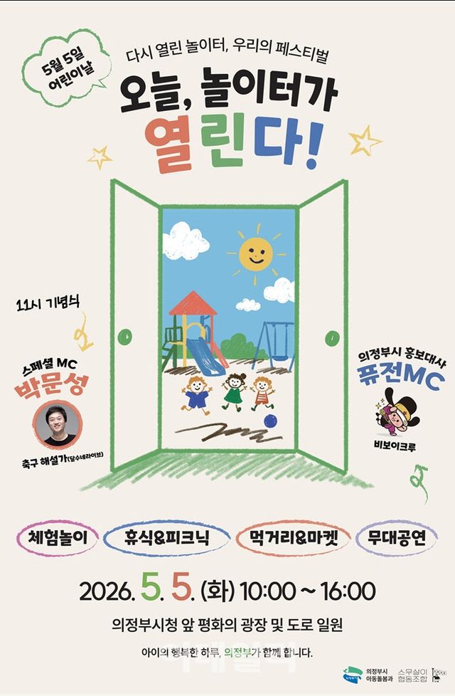 오전 11시에 열리는 어린이날 기념식에서는 모범 어린이와 아동복지 유공자 등에 대한 표창 수여가 이뤄진다. 특히 의정부 출신 박문성 축구해설가가 지역의 아이들을 위해 재능 기부로 기념식 사회를 맡기로 해 의미를 더했다.