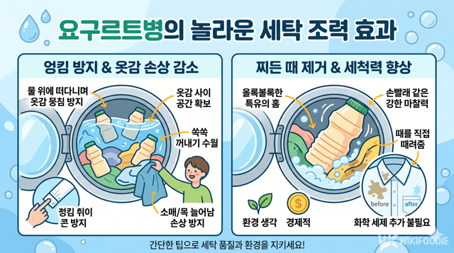세탁기가 세차게 돌아갈 때 내부의 빨랫감들은 강한 회전력으로 인해 소매나 바짓단이 서로 꼬이기 쉽다. 이렇게 뒤엉킨 빨래는 꺼낼 때도 힘들지만, 건조 후에도 주름이 깊게 남아 다림질이 힘들어지는 원인이 된다. 이때 빈 요구르트병 2~3개를 함께 넣으면 옷감 사이사이에 틈을 만들어주는 '세탁 볼' 역할을 한다.