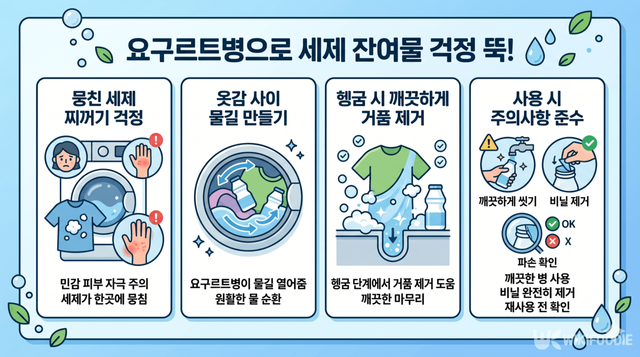 빨래를 마친 옷에 하얀 세제 찌꺼기가 남아 있으면 피부가 민감한 사람이나 아이들에게 자극을 줄 수 있어 주의가 필요하다. 요구르트병은 세탁조 안에서 물이 원활하게 순환할 수 있도록 돕는 통로를 만들어준다. 병이 옷감 사이사이를 헤집고 다니며 물길을 열어주기 때문에 세제가 한곳에 뭉치지 않고 고르게 녹아든다.
