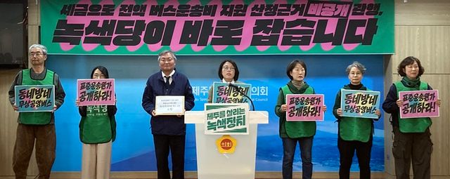 녹색당은 29일 제주도의회 도민카페에서 기자회견을 열고 "버스 준공영제의 투명성과 적정성을 확인하기 위해 제주도에 표준운송원가 산정용역 최종보고서 공개를 청구했지만 비공개 처분을 받았다"며 법원에 '표준운송원가 산정 용역 최종보고서에 관한 정보공개거부처분 취소' 행정소송을 제기한다고 밝혔다.