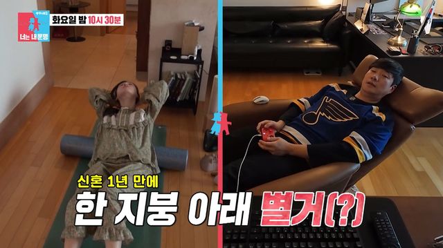 배성재는 방 안에서 게임에 몰두했고, 김다영은 거실에서 차를 마시고 운동을 하며 ‘따로 또 같이’의 생활을 이어갔다.