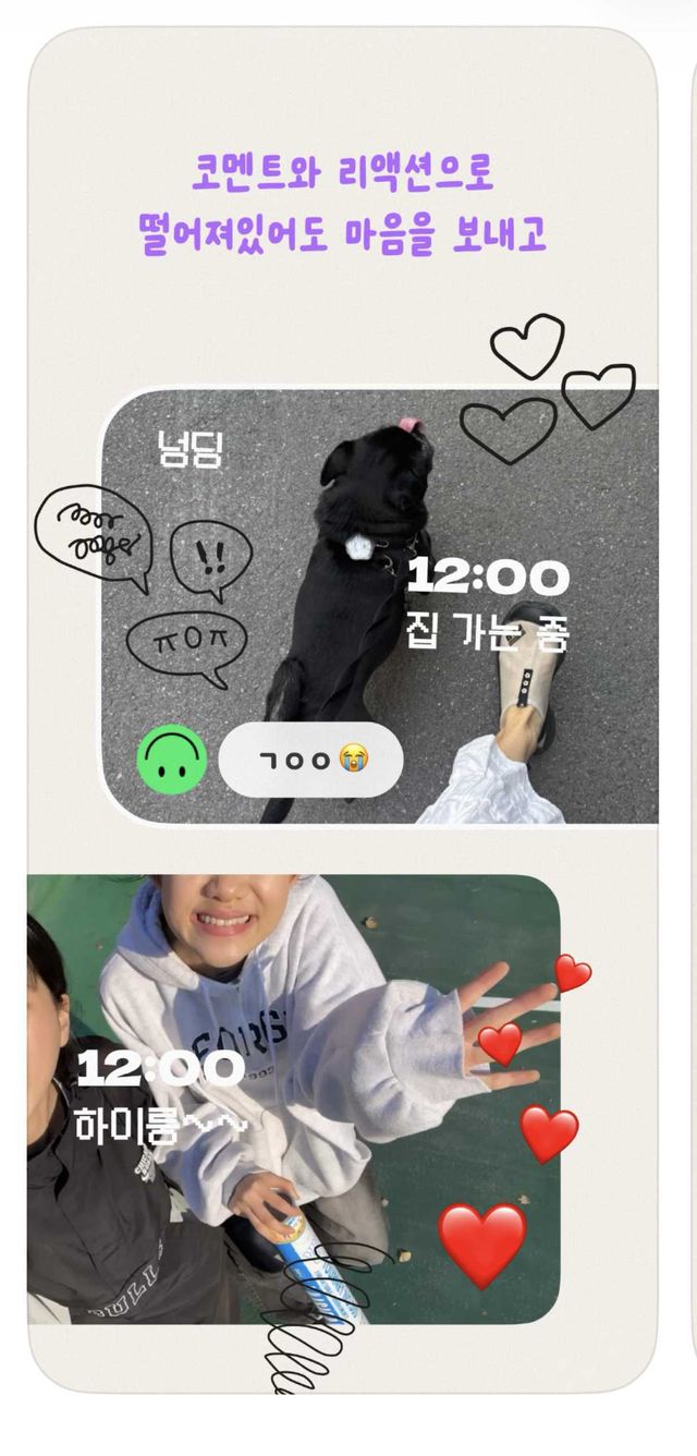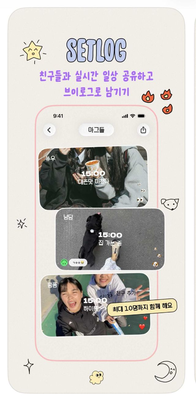 혼자 기록하는 방식 외에도, 친구들과 그룹을 만들어 분할 화면으로 서로의 일상을 실시간 공유하는 기능이 셋로그의 핵심 매력으로 꼽힌다. 각자 다른 공간에 있어도 같은 시간대에 촬영한 장면이 한 화면 안에 나란히 담겨 '함께하는 하루'를 만들어낸다. 이 공동 기록 기능이 특히 10~20대 사용자층에서 강한 반응을 이끌어내고 있다.