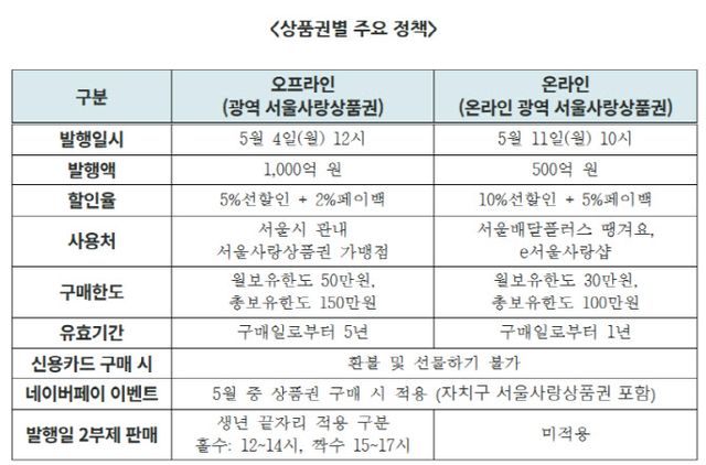 발행 당일인 5월 4일에는 안정적인 시스템 운영을 위해 서울페이플러스 앱의 ‘가맹점 찾기’ 및 ‘상품권 선물하기’ 기능이 오전 9시부터 오후 6시까지 일시 중단된다.
