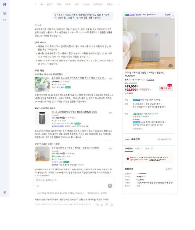 직접 체험해 본 AI탭의 강력한 무기는 네이버만의 ‘버티컬 생태계’다. 쇼핑 영역은 특히 영리했다. “공기청정기를 사려는데, ‘내돈내산’ 언급이 있는 후기 중 가성비 좋고 소음 적은 제품을 추천해줘”라고 묻자, AI탭은 방대한 블로그와 쇼핑 리뷰를 분석해 실제 사용자들이 긍정적으로 평가한 제품군을 추려냈다. 화면 내에서 상세 정보 확인부터 구매까지 원스톱으로 이어지는 동선은 쾌적함 그 자체였다.