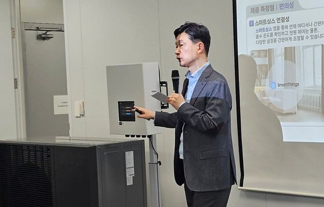 송 그룹장은 자사 히트펌프의 장점으로 연결성과 제어를 꼽았다. '스마트싱스'(SmartThings)를 통해 외부에서 터치 디스플레이로 온도를 확인하고 원격 제어도 할 수 있다.