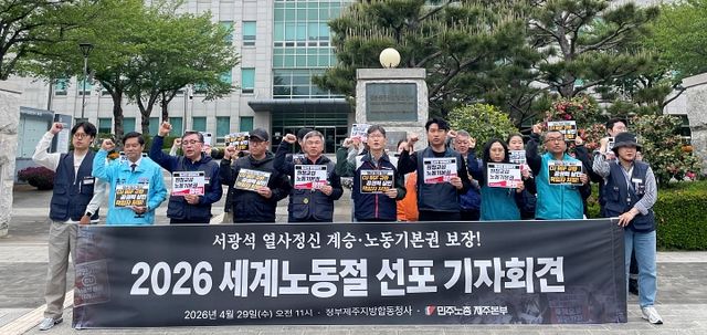 민주노총 제주본부는 29일 오전 제주지방합동청사 앞에서 ‘2026 세계노동절 선포 기자회견’을 개최했다. 양유리기자