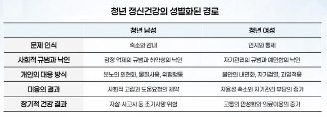청년 남성은 문제를 축소하거나 참고 넘기는 경향이 강하다. 감정 억제 규범 속에서 분노를 외부로 표출하거나 위험 행동으로 이어지며 사회적 고립이 심화되는 특징을 보인다. 반면 여성은 불안과 우울을 내면화하며 자기검열과 과잉 적응으로 대응한다. 이 과정에서 자율성이 줄고 자기관리 부담이 커지며 고통이 만성화되는 양상이 나타난다는 것이다.
