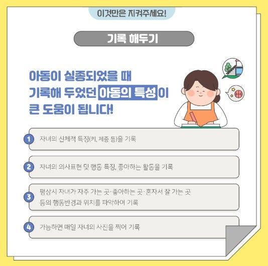 실종을 완전히 막을 수는 없지만, 대비를 통해 위험을 줄일 수는 있다. 특히 보호가 필요한 아동의 경우에는 사전에 여러 상황을 고려한 준비가 필수적이다.