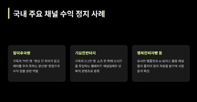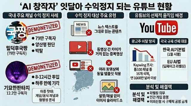 특히 기묘한판타지 운영자는 유튜브의 이중잣대를 지적했다. 그는 “항상 같은 배경음악에 동일한 템플릿으로 음식 영상을 올리는 채널, 매번 동일한 게임 플레이 영상을 올리는 채널은 반복 콘텐츠가 아니면서, 등장 캐릭터·스토리·연출·대사를 매번 달리해도 AI로 만들었다는 이유만으로 양산형 콘텐츠로 규정하는 기준을 납득하기 어렵다”고 토로했다.
