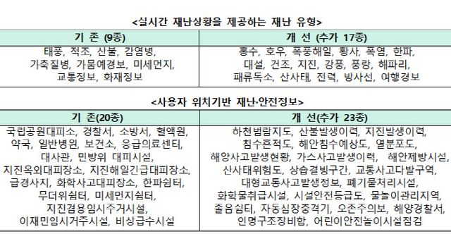 기상특보나 사고정보 등 실시간 재난상황 정보를 제공하는 재난 유형은 기존 9종에서 26종으로 확대했다. 특히 재난별 상황정보, 재난문자, 대피소 위치, 국민행동요령을 통합 안내함으로써 위기 상황에서 국민이 신속하게 대처할 수 있도록 돕는다.