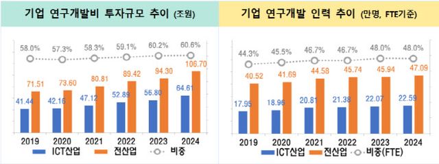 과학기술정보통신부와 정보통신기획평가원(IITP)이 29일 발표한 ‘2024년도 ICT 기업 R&D 통계’에 따르면, ICT 기업의 연구개발비는 우리나라 전체 산업 연구개발비(106.7조원)의 60.6%를 차지하며 국가 기술 혁신의 중추 역할을 수행하고 있다. 특히 반도체와 인공지능(AI) 분야를 중심으로 투자가 확대되면서 2019년 이후 이어지던 점진적 상승 추세가 2024년 들어 최대폭 증가로 전환됐다.