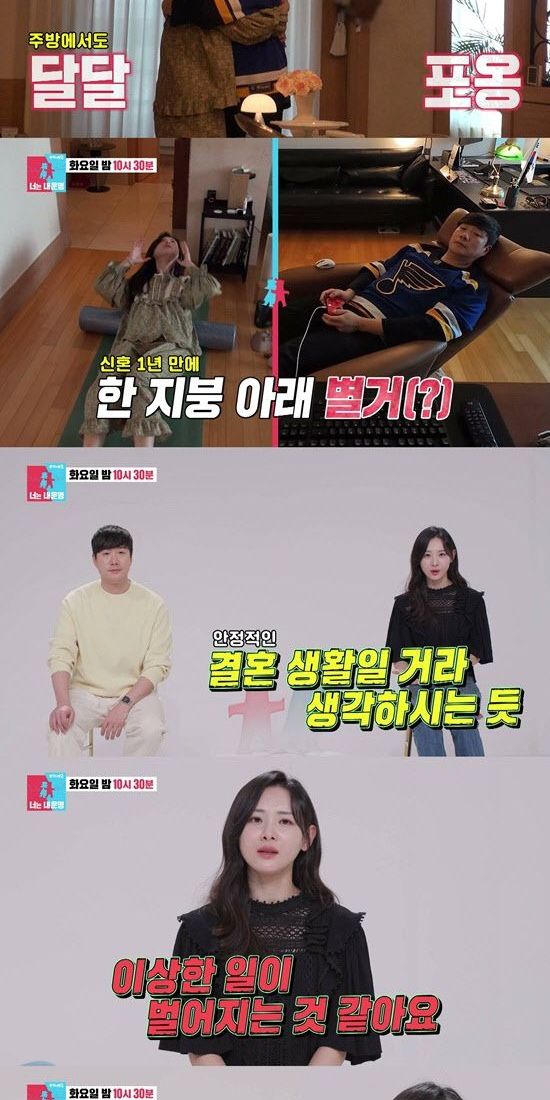 그러나 달달한 분위기도 잠시, ‘신혼 1년 만에 한 지붕 아래 별거(?)’라는 자막과 함께 각자 다른 방에서 시간을 보내는 부부의 모습이 그려졌다. 배성재는 방 안에서 홀로 게임에 열중했고, 김다영은 거실에서 차를 마시고 운동을 하며 혼자만의 시간을 보냈다.