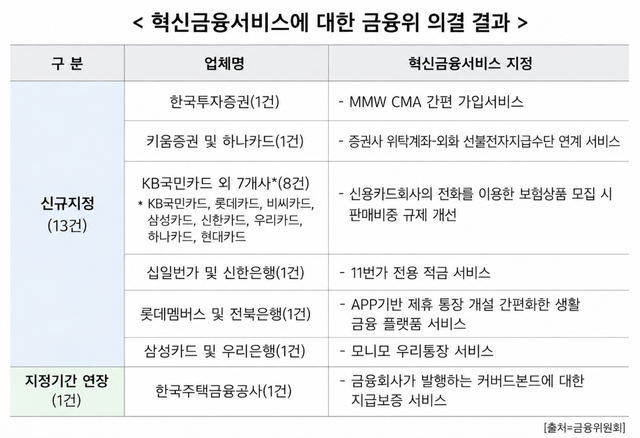 금융위원회는 29일 'MMW-CMA 간편 가입 서비스' 등 13건의 혁신금융서비스를 신규 지정했다. 이로써 누적 혁신금융서비스 지정 건수는 총 1072건으로 늘었다. 이번 지정안에는 비대면 투자상품 가입 절차 간소화, 외화투자 연계 서비스, 플랫폼 기반 제휴 예·적금 확대, 보험 판매 규제 완화 등이 포함됐다.