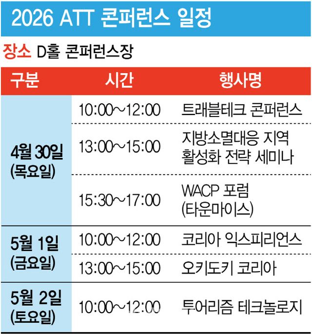 둘째 날인 1일엔 주한 외국인·유학생 커뮤니티를 정식 초청하는 ‘KX(코리아 익스피리언스) 글로벌 여행 커뮤니티 밋업’을 시작으로, 토크쇼 ‘오키도키 코리아’가 이어진다. 방송인 알베르토 몬디, 네팔 출신 수잔 사키아, 전 한국관광공사 홍보대사 자히드 후세인 등이 무대에 오르는 토크쇼에선 외국인 시선에서 바라본 K관광의 강점과 약점을 가감 없이 진단한다. 마지막 날인 2일엔 한국스마트관광협회가 주관하는 ‘투어리즘 테크놀로지(TT) 워크숍’이 콘퍼런스 존 프로그램의 마침표를 찍는다. 생성형 인공지능(AI) 기반 여행사 운영 혁신, 미식관광 데이터 사업화 전략 등 트래블테크 최신 동향을 점검할 예정이다.
