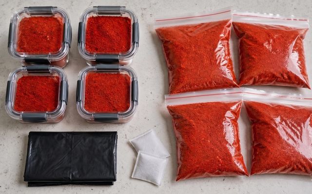 고춧가루는 습기에 민감하다. 용기가 제대로 밀폐되지 않으면 공기 중 수분을 흡수해 가루가 눅눅해지고 덩어리질 수 있다. 습도가 높아지면 곰팡이가 생기기 쉬워지므로 밀폐는 기본이다. 지퍼백을 사용할 때는 내부 공기를 최대한 빼고 닫는 것이 좋다. 유리병이나 플라스틱 용기에 담을 때는 뚜껑을 단단히 닫고, 필요하면 입구에 랩을 한 겹 씌워 공기 유입을 줄일 수 있다.