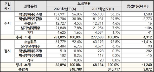 4년제 대학 간 협의체인 대교협은 총 194개 대학의 대입전형 시행계획을 취합한 결과, 현재 고교 2학년들이 응시할 2028학년도 대입에서 대학들은 총 34만 8789명을 모집하는 것으로 나타났다. 이는 전년도(2027학년도) 34만 5717명보다 3072명 증가한 수치다.