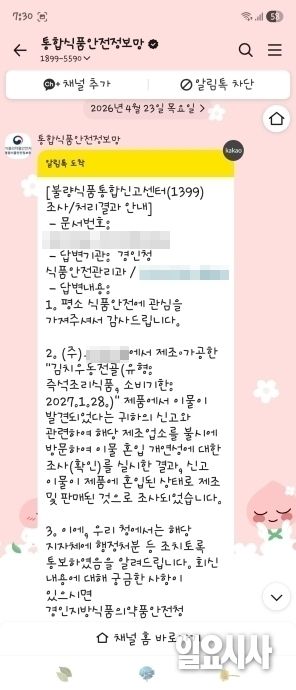 이에 대해 B사 품질팀 담당자는 “먼저 불편을 겪은 고객에게 죄송하다는 말씀을 드리고 싶다”며 “식약처 조사가 진행되면 관련 답변은 행정 절차를 통해 이뤄지는데, 조사 결과 공문이 이날 도착해 고객에게도 원인과 재발 방지 내용을 전달했다”고 밝혔다.
