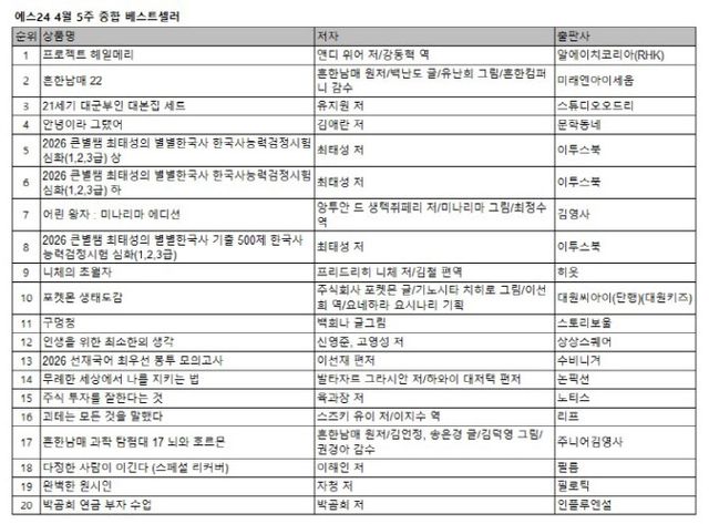 앤디 위어의 ‘프로젝트 헤일메리’는 5주 연속 1위를 차지하며 4월 내내 정상을 지켰다. 이어 ‘흔한남매 22’가 2위, ‘21세기 대군부인 대본집 세트’가 3위에 올랐다. 김애란 작가의 ‘안녕이라 그랬어’는 4위, ‘2026 큰별쌤 최태성의 별별한국사 한국사능력검정시험 심화(1·2·3급) 상’은 5위를 기록했다.