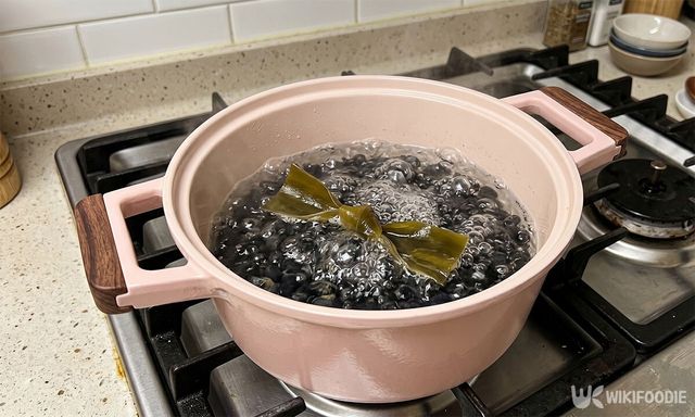 냄비에 볶은 서리태를 넣고 물 3컵과 건다시마 5g을 넣어 끓인다. 다시마는 별도의 육수 없이도 국물 맛을 깊게 만들어준다.