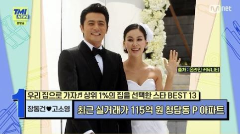 2021년 7월, Mnet 'TMI NEWS'에 방송된 내용에 따르면 고소영은 150억 원대의 청담동 건물을, 장동건은 약 130억 원의 한남동 5층짜리 건물을 소유하고 있습니다. 또한 경기도 가평에 지은 별장은 제22회 세계 건축상을 수상한 건물로 약 24억 원입니다.