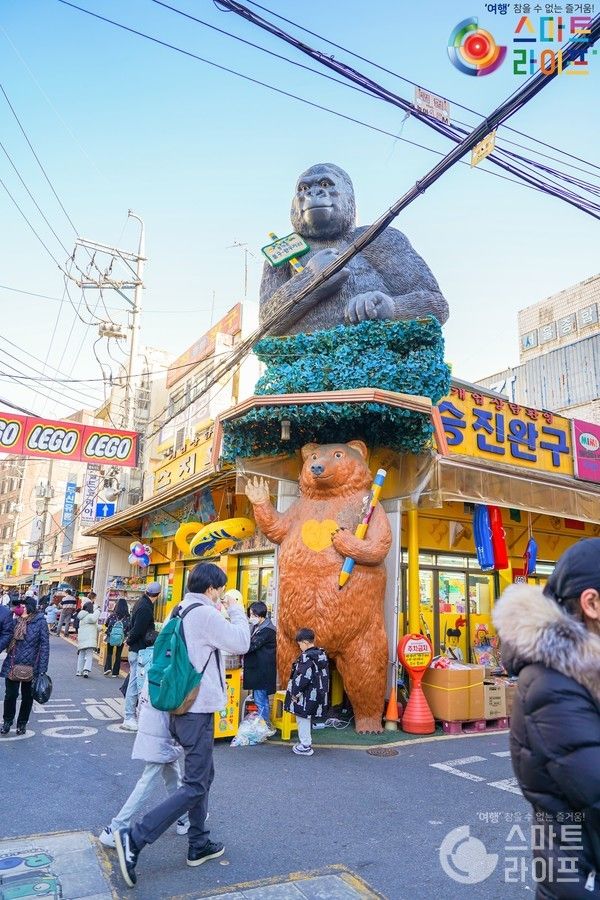 창신동 완구거리에서 가장 유명하다는 고릴라와 곰 조형물. 앞에는 귀여운 토끼, 오리 솜사탕을 팔고 있어 줄을 설 정도로 팔리고 있었다.