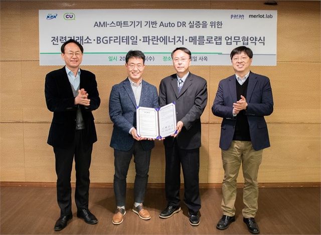 15일 BGF리테일 사옥에서 열린 Auto DR 실증 업무 협약식에는 BGF리테일 류철한 경영지원부문장과 전력거래소 김상일 전력시장 본부장을 비롯해 전력 수요 관리사업자 파란에너지, 스마트기기 설비 업체 메를로랩 실무진들이 함께 참여해 편의점 전력 저감 활성화 방안을 공유하는 시간을 가졌다.