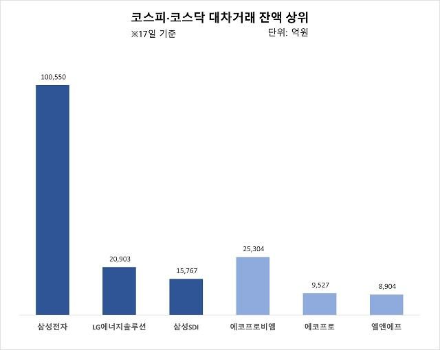 코스피에서 대차 잔액이 가장 많은 종목은 삼성전자다. 삼성전자의 대차 잔액은 10조550억원으로 압도적으로 많다. 이어 LG에너지솔루션이 2조903억원, 삼성SDI가 1조5767억원 순으로 대차 잔액이 많다. 코스닥에선 에코프로비엠이 2조5304억원으로 대차 잔액 1위를 기록했다. 뒤이어 에코프로 9527억원, 엘앤에프 8904억원 순으로 나타났다.