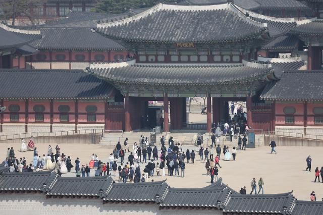 포근한 날씨를 보인 19일 경복궁을 찾은 외국인 관광객과 시민들이 오가고 있다. [사진=연합뉴스]