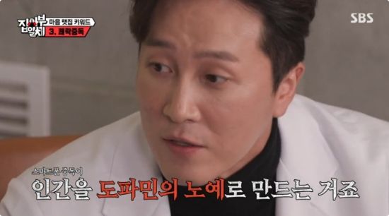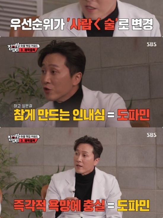 은지원은 "그 도파민이 나쁜 거냐"라며 궁금해했고, 양재웅은 "생존을 위해 가장 필수적인 뇌의 신경 전달 물질이다. 장기적인 목표를 설정했을 때 이대호 씨 같은 경우에 홈런왕이라고 하면 그걸 위해 내가 당장 하고 싶은 걸 참고 배트 한 번 휘두르는 것도 도파민이 있어야 가능하다. 홈런왕 너무 되고 싶지만 배가 너무 고파. 맛있는 거 먹으면서 기분 좋게 하는 이것도 도파민이 하는 거다"라며 강조했다.