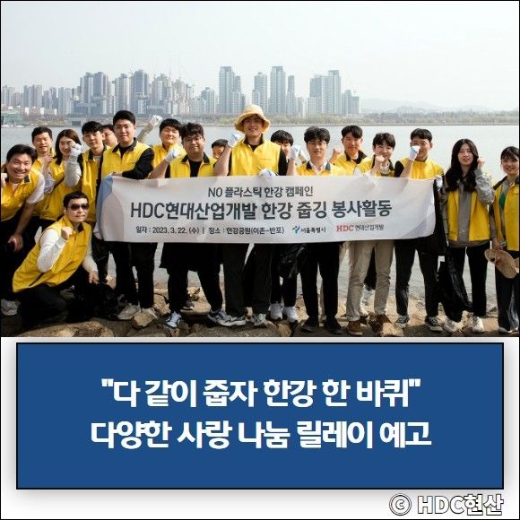 봉사활동에 참여한 HDC현산 직원은 "NO플라스틱 한강 캠페인 활동에 참여하게 된 이유는 평소에도 탄소 저감, 기후 위기, 한강 생태 보존에 관심이 많았기 때문"이라며 "앞으로도 회사가 진행하는 다양한 사회공헌 활동에 적극 참여할 것"이라고 말했다.