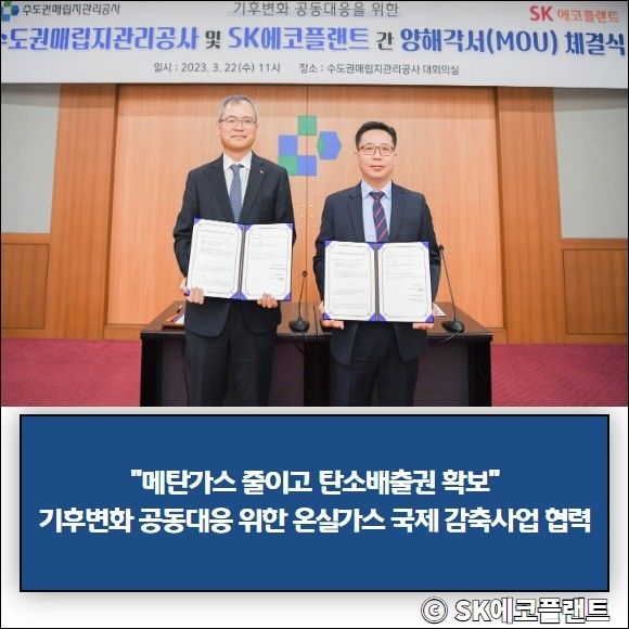 SK에코플랜트가 지난 22일 수도권매립지관리공사와 '기후변화 공동대응을 위한 온실가스 국제 감축사업 협력'에 대한 업무협약을 체결했다. 협약식에는 이대혁 SK에코플랜트 글로벌에코BU 대표와 이규성 수도권매립지관리공사 사장직무대행 등 양사 관계자들이 참석했다.