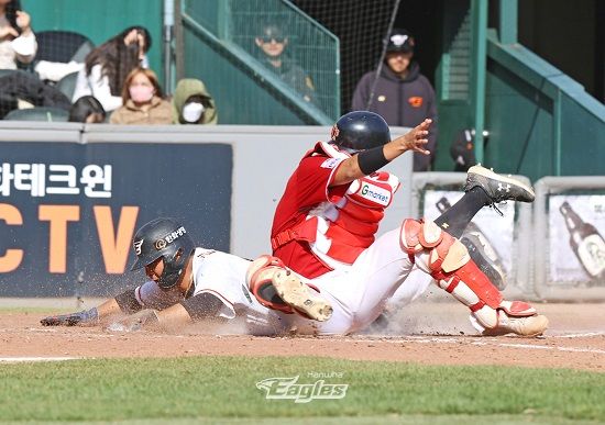 '준족'과는 거리가 먼 김태연이 벤치 사인이 내려지자 곧바로 과감하게 홈 플레이트를 향해 몸을 내던진 실행력이 수베로 감독을 웃게 만들었다.