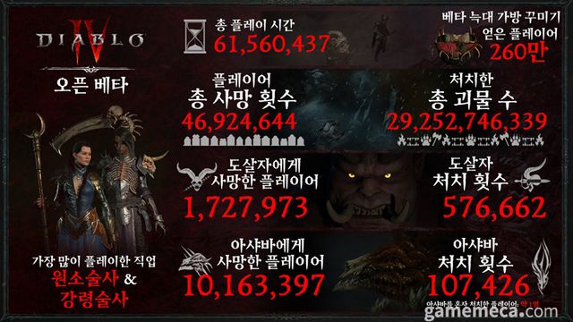 블리자드는 31일, 디아블로 4 베타 주요 수치 및 플레이 기록을 발표했다. 이에 따르면 베타 기간 총 플레이 시간은 약 6,156만 시간으로, 이는 디아블로 시리즈 베타 사상 가장 높은 수치다. 이어서 유저들이 가장 많이 한 캐릭터는 원소술사와 강령술사로, 두 캐릭터 모두 이번 테스트에서 OP로 평가됐다.