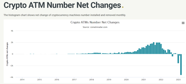 데이터에 따르면 비트코인 ATM은 지난 2013년 10월 29일 최초로 출시된 이후 약 10년 간 매달 설치 대수가 제거 대수 보다 많은 상태를 유지했다.