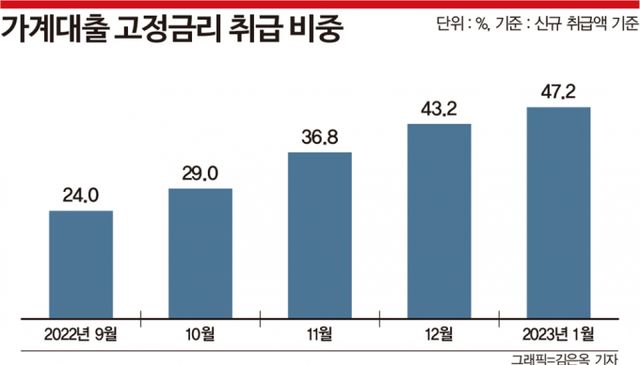 우리은행은 2021년 약 30%였던 신규 고정금리 주담대 비중이 지난해 80%에 올 들어 90%까지 높아졌다.