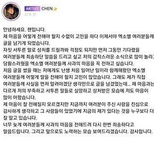 이에 따라 팬들은 해시태그 총공과 택배 총공 버스광고 등을 통하여 첸의 탈퇴를 요구하였다. 이에 첸은 "자칫 서투른 말로 상처를 드릴까 봐 걱정도 되지만 먼저 그동안 기다렸을 여러분께 죄송하단 말씀을 드리고 싶고 저의 갑작스러운 소식으로 많이 놀라고 당황스러웠을 엑소엘 여러분께 사과의 마음을 꼭 전하고 싶습니다"라며 사과문을 올렸다.