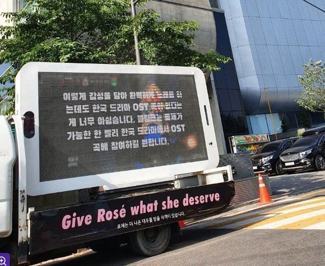 로제의 팬들은 "과거 약속했던 로제의 솔로 앨범 발매 약속이 지켜지지 않았다"라며 로제를 위하여 개인 촬영, 예능 게스트 출연, OST 작업 등 다양한 활동을 할 수 있게 지원해 달라고줄것을 요구하였다. 트럭의 문구에는 "이렇게 감성을 담아 완벽하게 노래하는데도 드라마 OST 한 곡 없다는 게 너무 아쉽습니다. 로제가 드라마 OST 곡에 참여하길 원합니다."라고 적혀있었다.