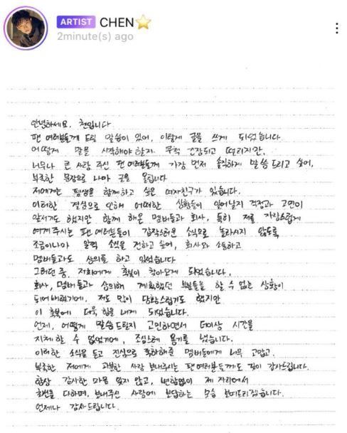 첸은 지난 2020년 1월13일 엑소 팬클럽 사이트에 자필로 결혼 소식을 알렸었다. 자필 편지로 평생 함께하고 싶은 여자친구가 있으며 여자친구와 결혼한다는 내용과 축복이 찾아왔다며 혼전임신을 알렸다.